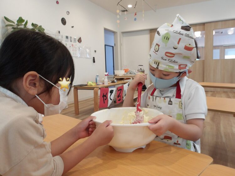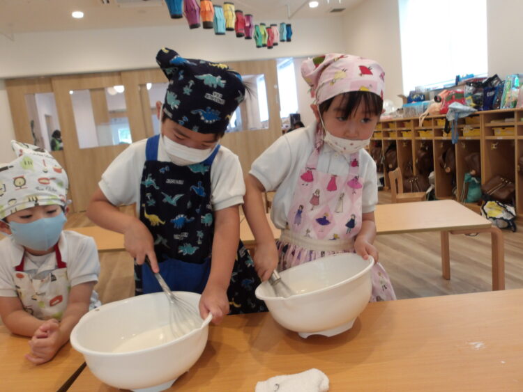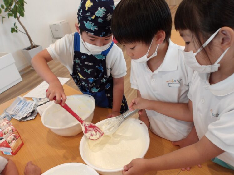 保育者も一緒に行い、みんなで協力し合って混ぜ続けると、ようやくツノが立ってきました✨