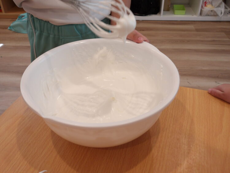 と友だちと協力しながら、ふわふわホイップになるまで混ぜていきました。
