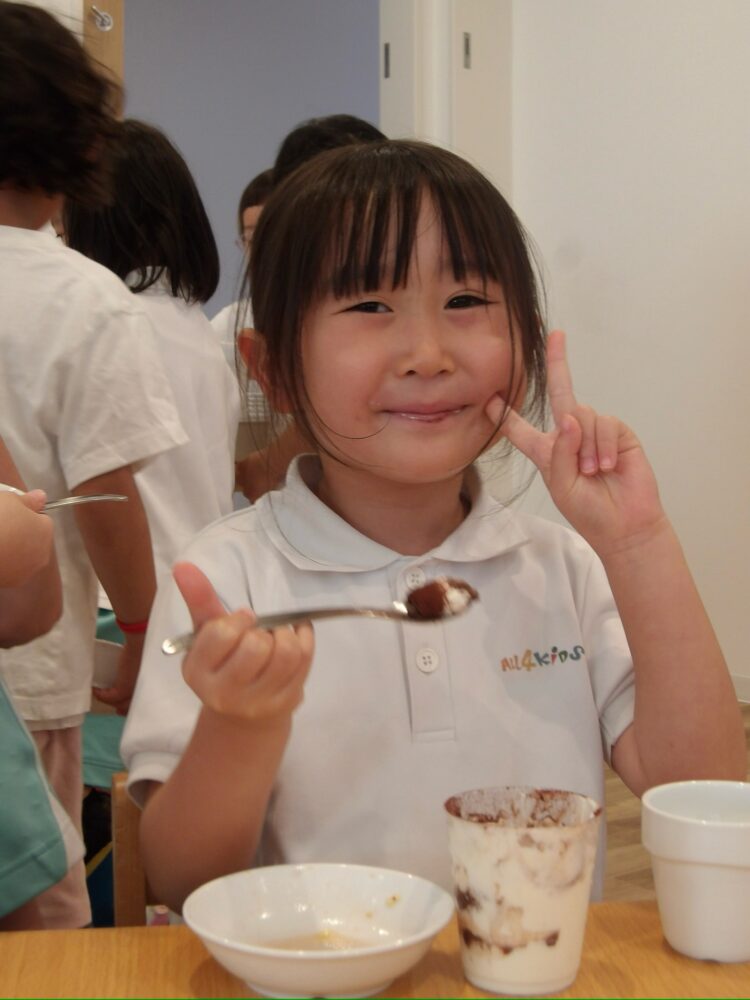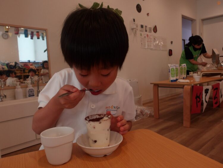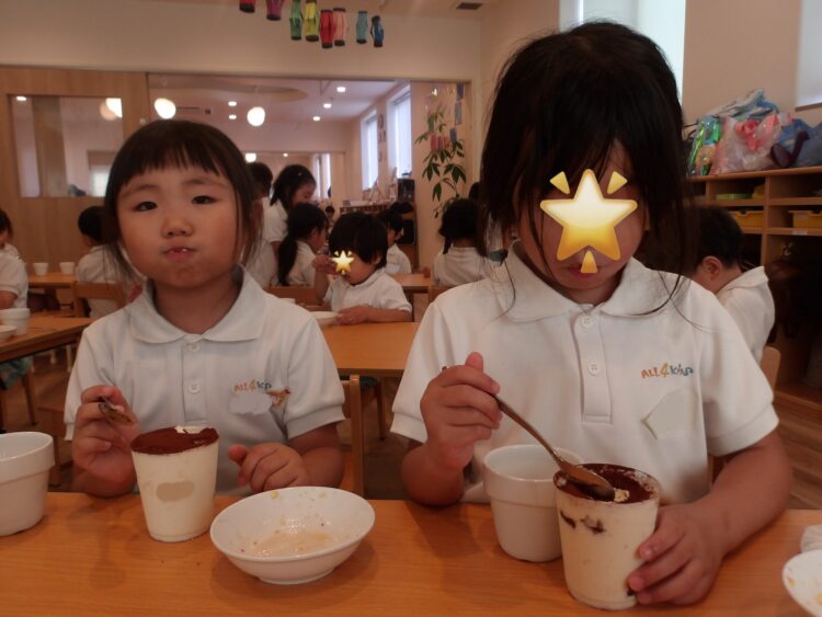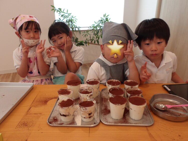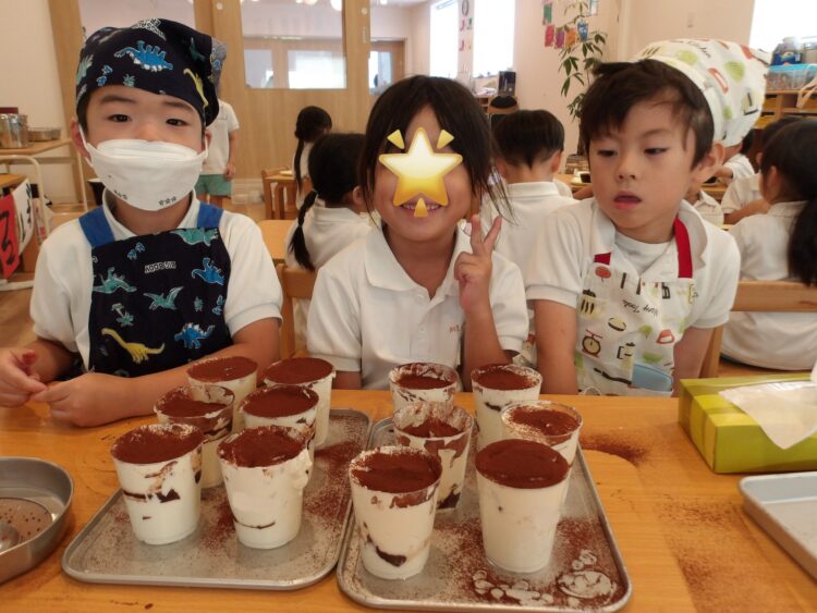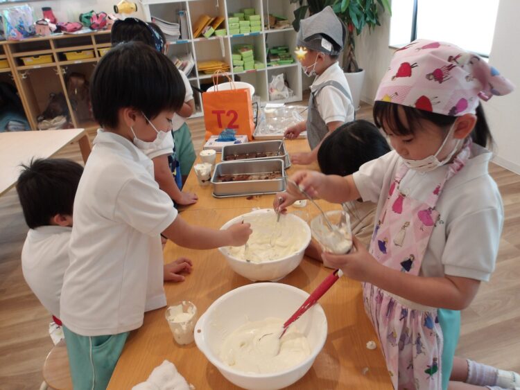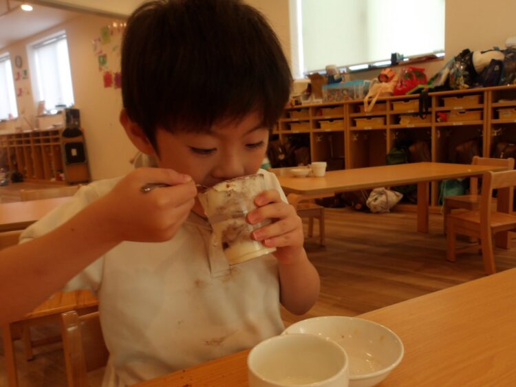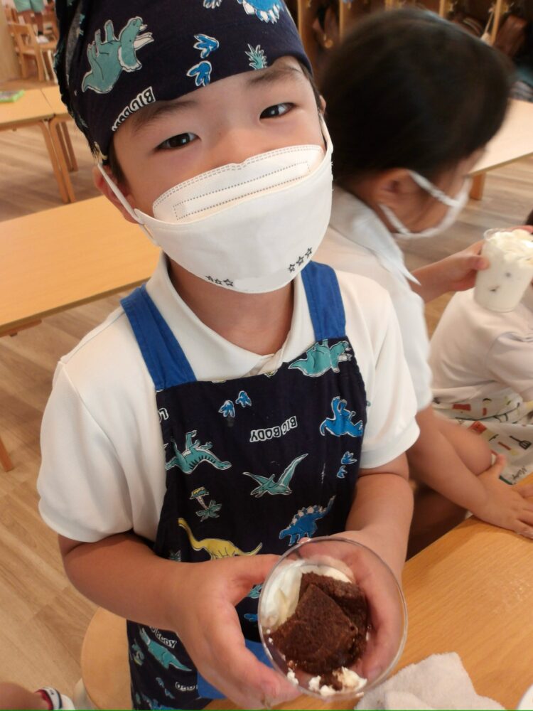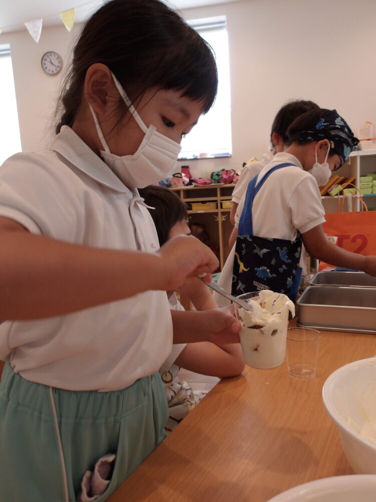 「このクリーム美味しそうだから沢山入れる!」と多めに入れたり、外側から見て、綺麗な層になるように丁寧に作ろうとする姿が見られました。