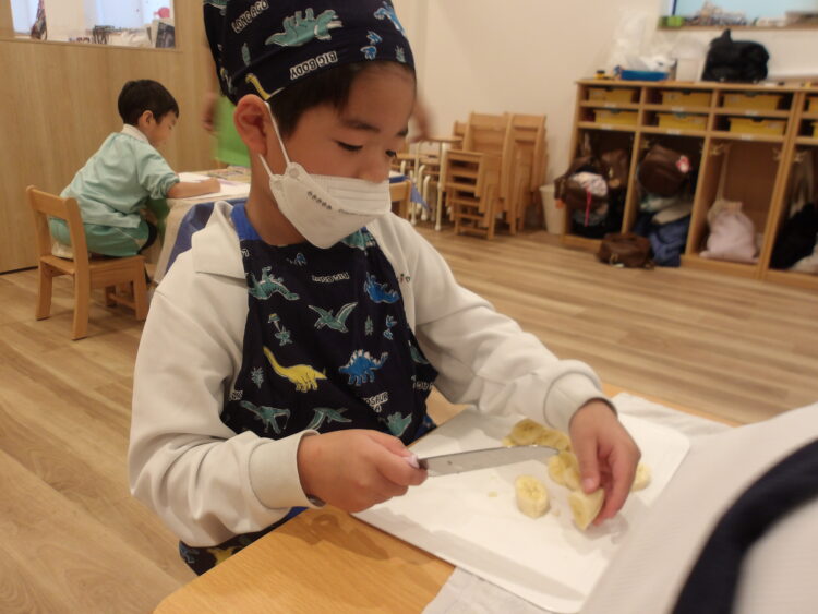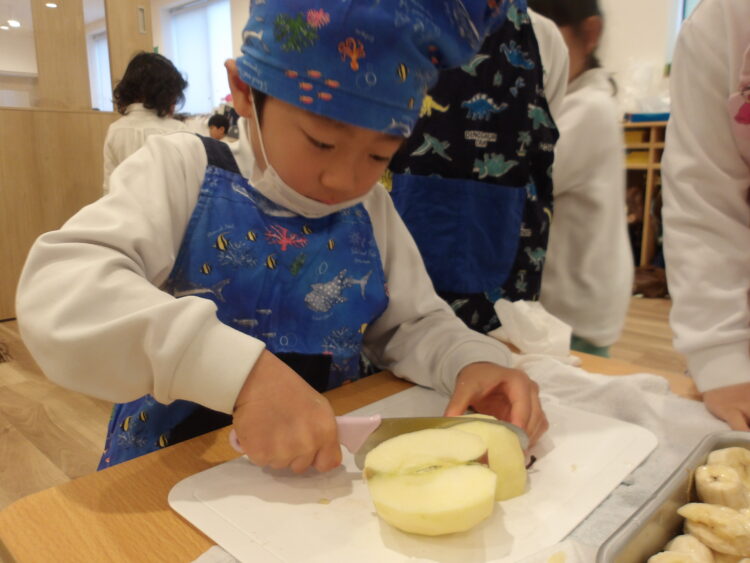バナナは簡単でしたが、硬いリンゴや皮が滑るブドウなど、果物の特徴によって包丁の使い方が違いますね。