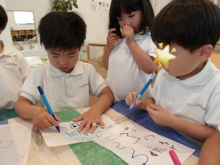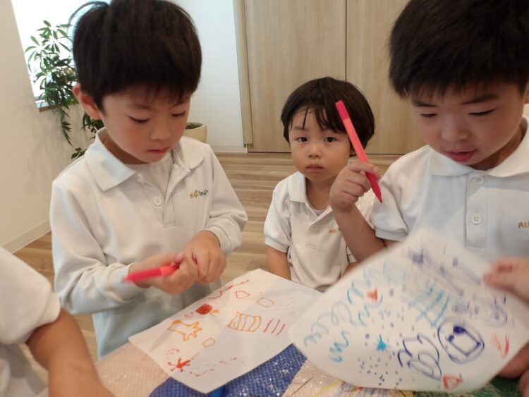 沢山描いてある方が後で綺麗に色が出るよ、と伝えると、たくさんの絵や線を描いていましたよ。
