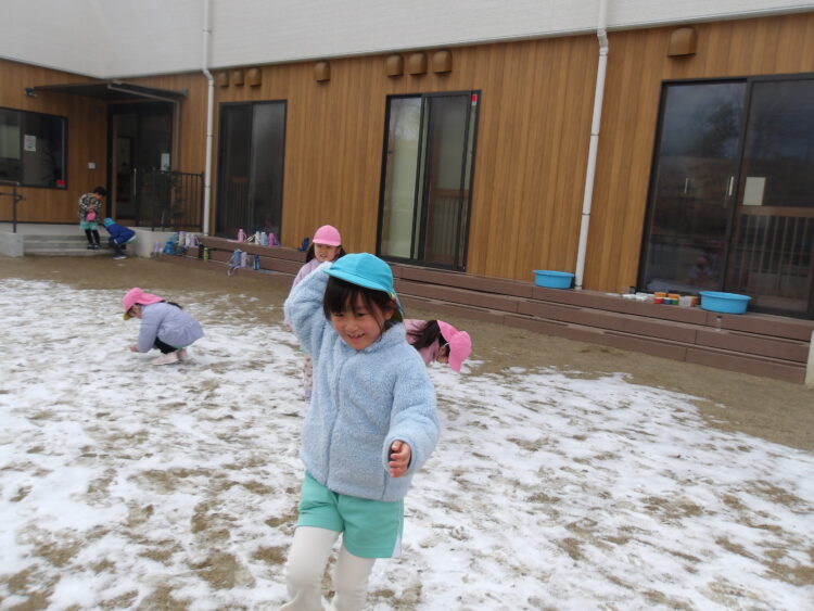 昨日降った雪が園庭に残っていたので、雪あそびをしましたよ!