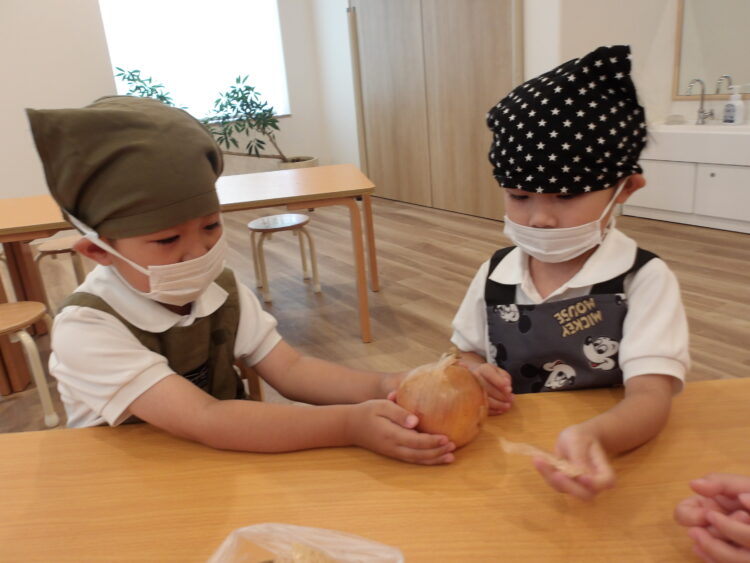 「剥きすぎると、玉ねぎが小さくなっちゃうよ」と声をかけると、