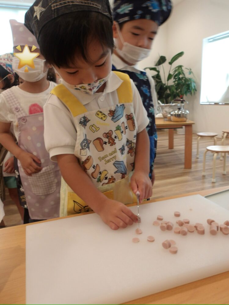 ソーセージは保育者の見守りの下、1人で切ることができました。