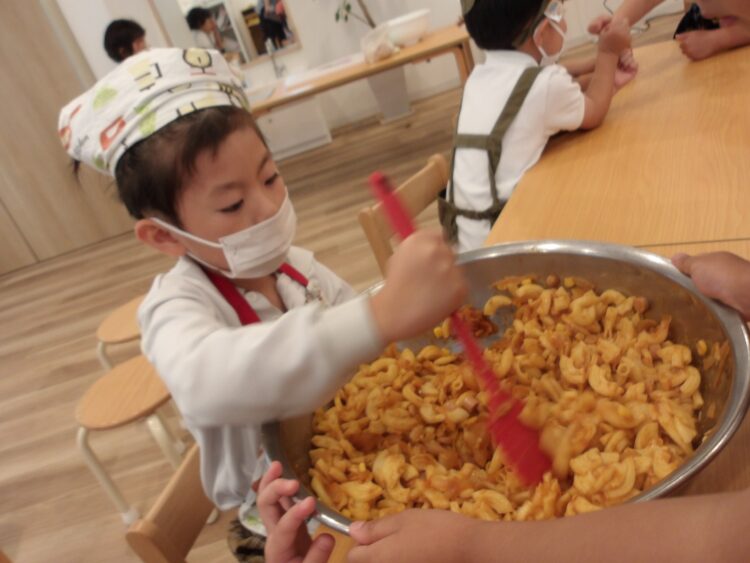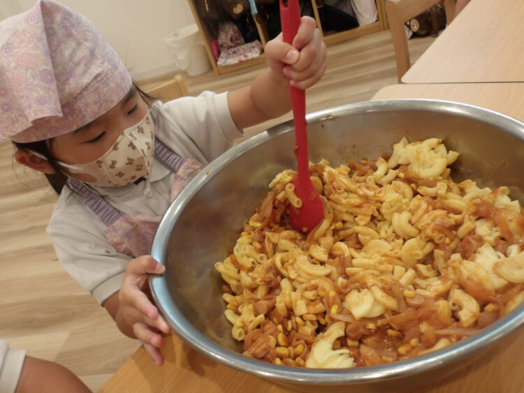 最後に煮詰めたケチャップソースと火を通した具材たち、茹でたマカロニをみんなで混ぜて出来上がり。