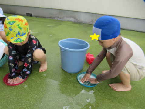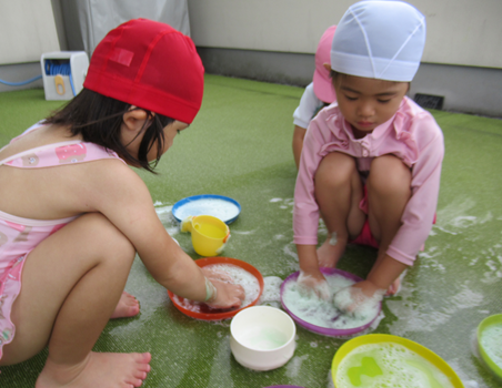 両手に泡を持ち触ってみたり、「おそうじする!」とお皿やプール遊びのおもちゃを掃除していました![]()