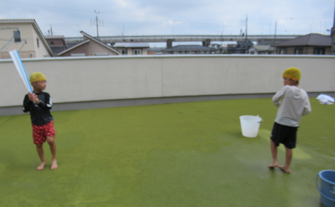 野球大好きなお友だちは、長い板をバット、水風船をボールに見立てて野球をしていましたよ⚾