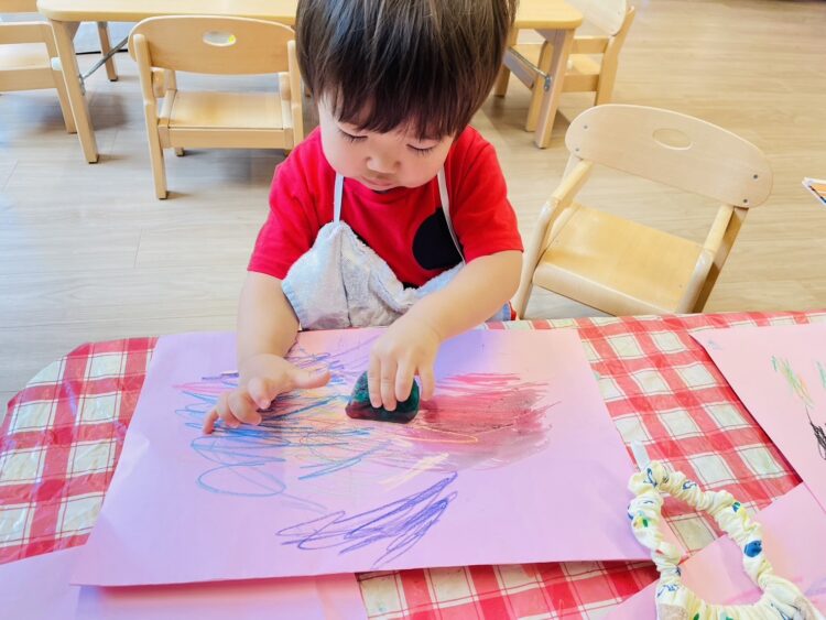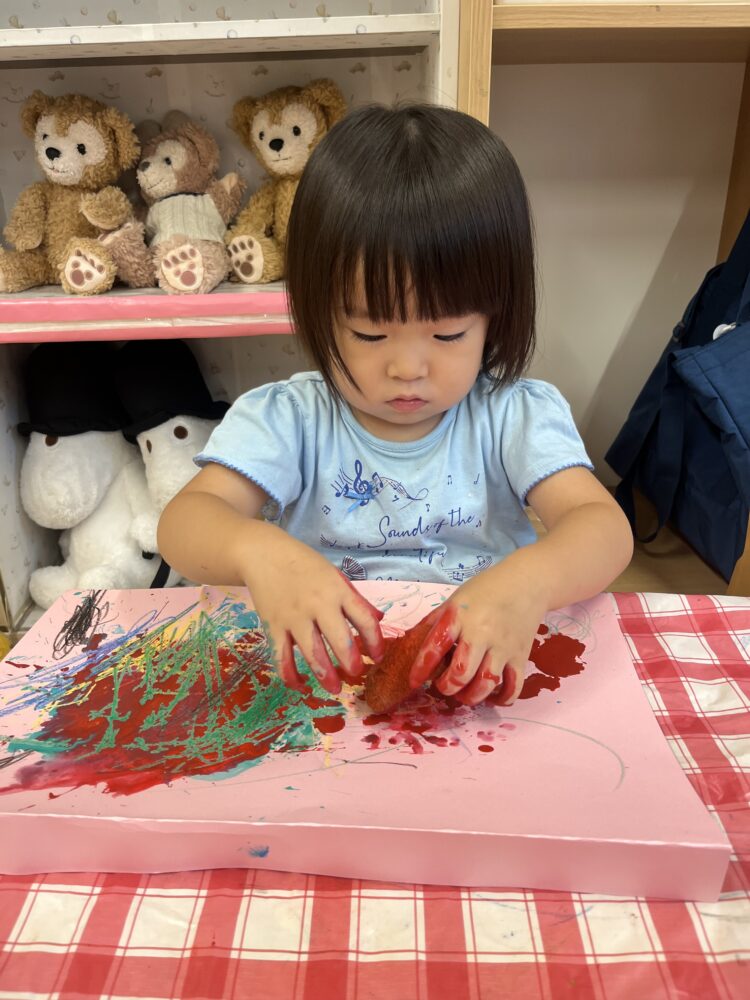 始めは、手が汚れるのに抵抗があった子もだんだんと慣れてきて上手にポンポンできました⭐️