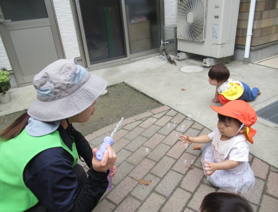 午前中は曇っていたので園庭で移動運動やしゃぼん玉を楽しみました🎵
