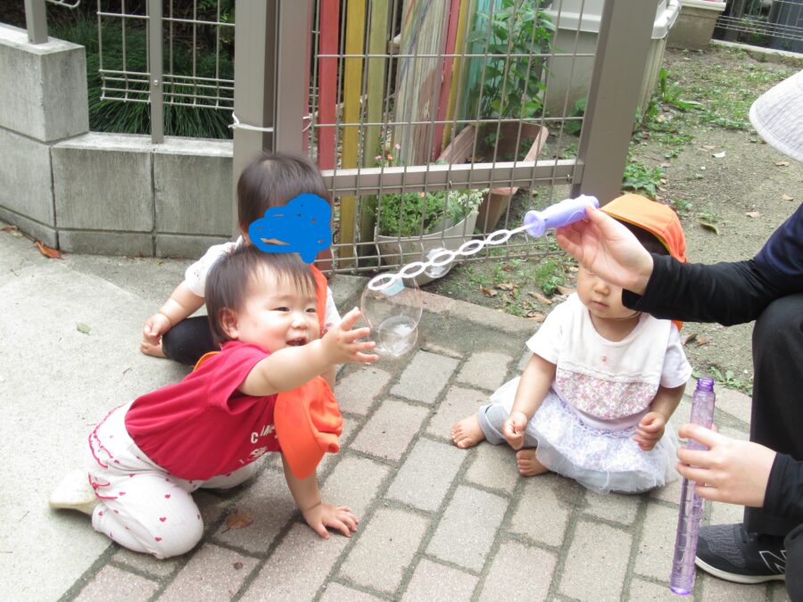 しゃぼん玉に触れたくて手を伸ばしたり