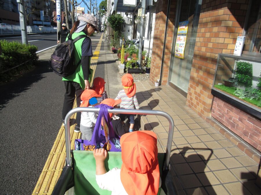 お友だちと手を繋いでのお散歩もとても上手です、カートに乗っているお友だちも一緒に、ネコさんいるかな、ショベルカー見えるかな、と楽しみに出掛けました。