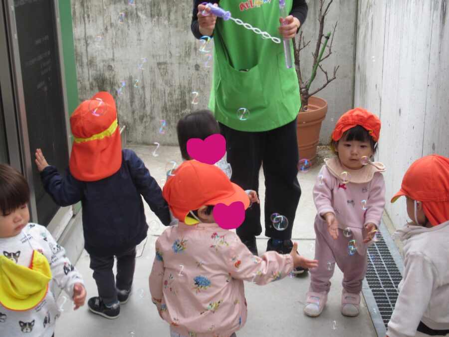 なので、ひよこ組は玄関の軒先で→しゃぼん玉♬