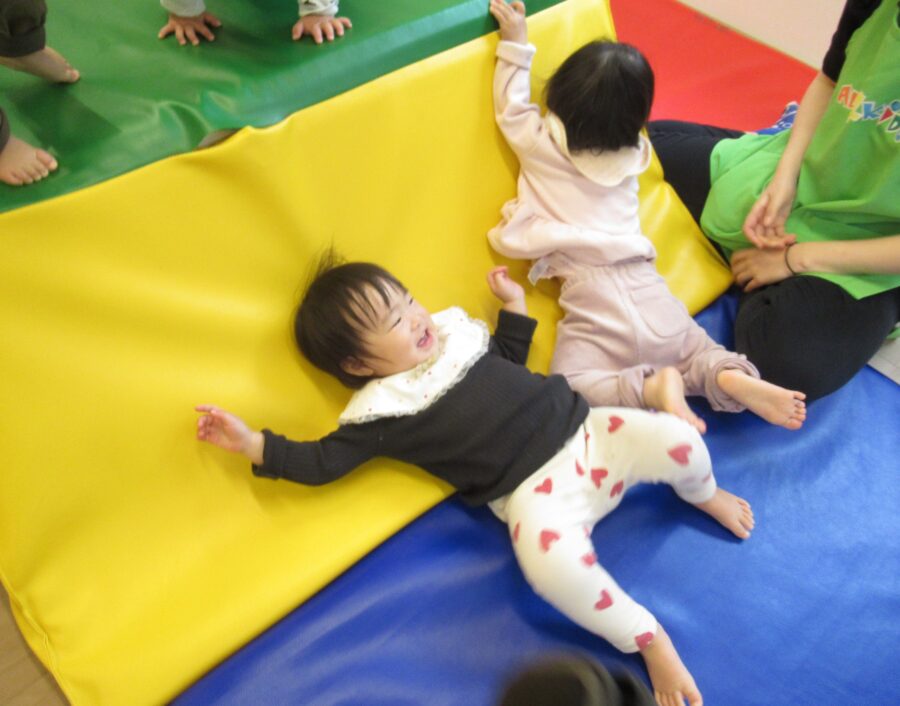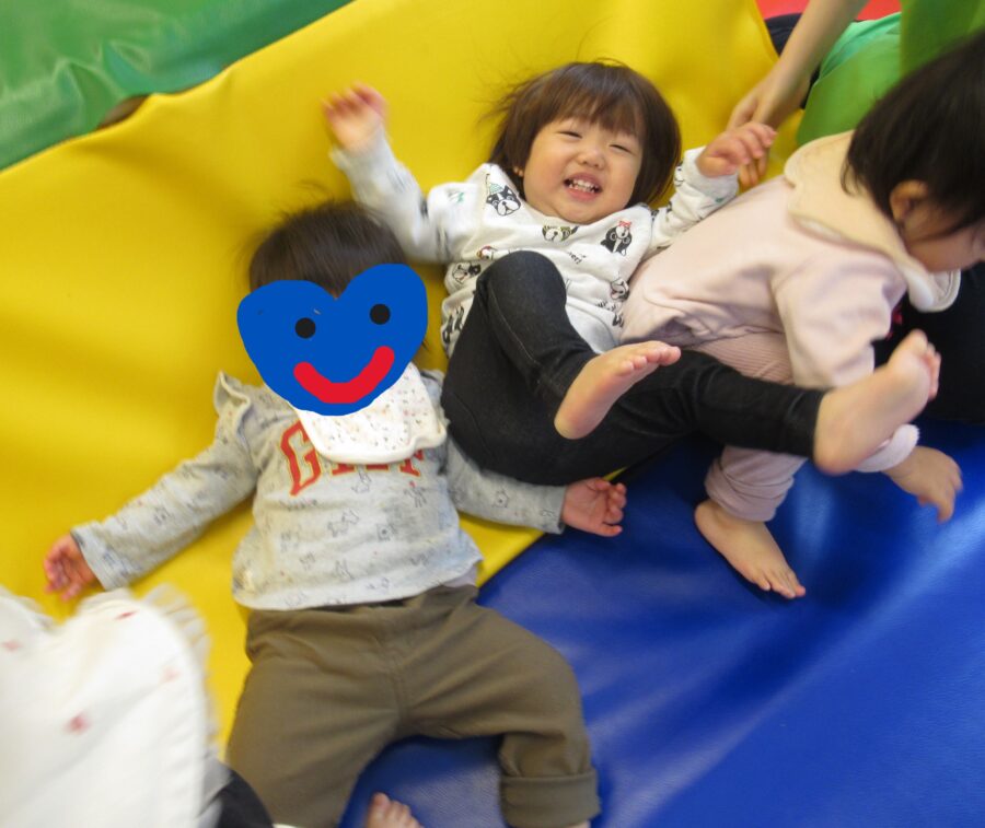 マットの滑り台はコットを重ねて作りました。両手足を使って簡単に登り、繰り返し滑ってケラケラ😆😆
