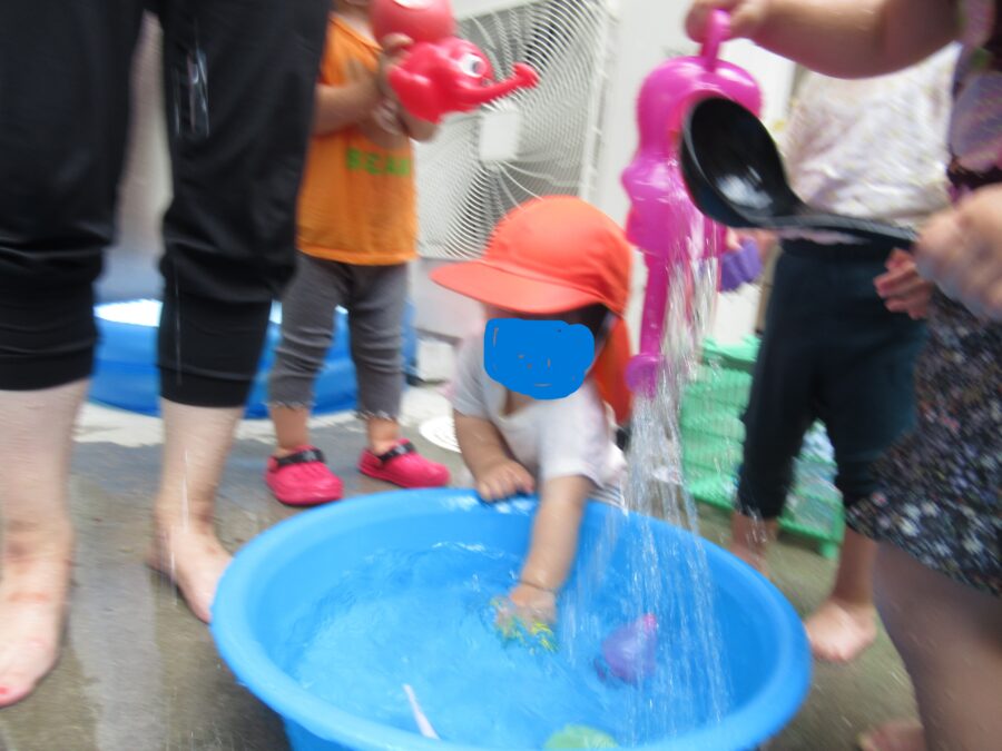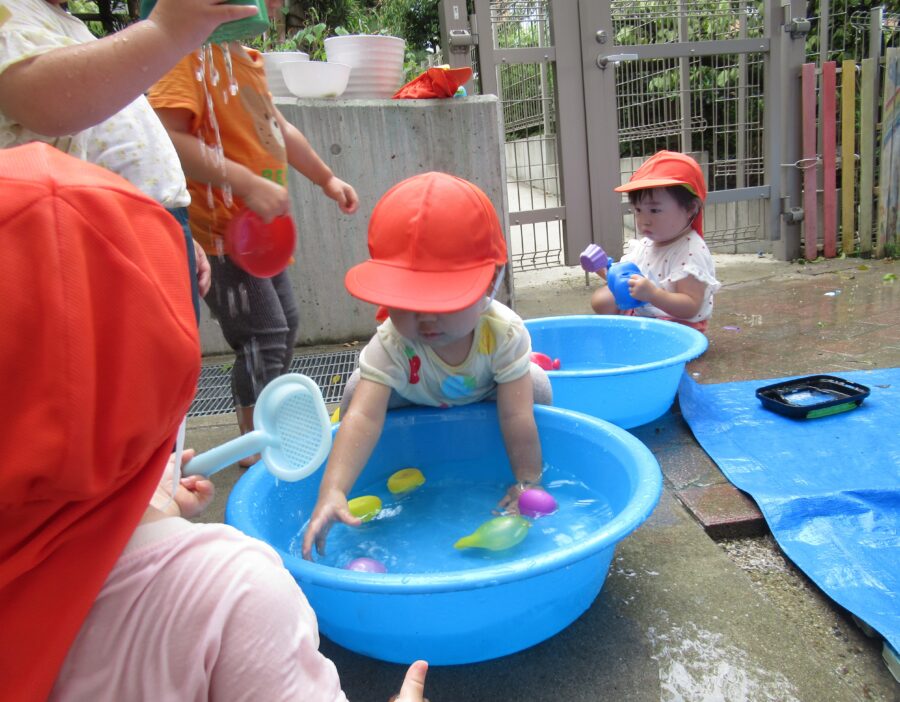身体はプールやタライに入らずに外から手を入れて遊んでいます。