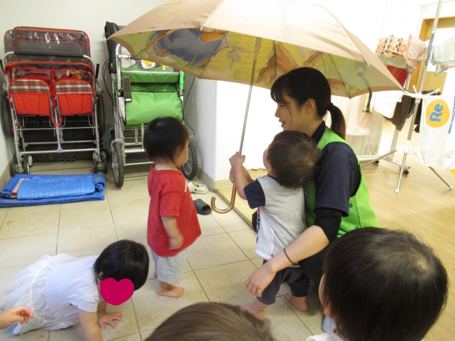 保育士が傘を1本取り出し、広げてみます。