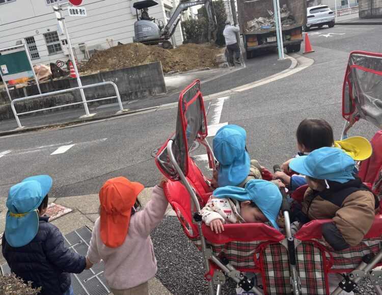 動いているショベルカーに興味津々なひよこうさぎ組さんです✨