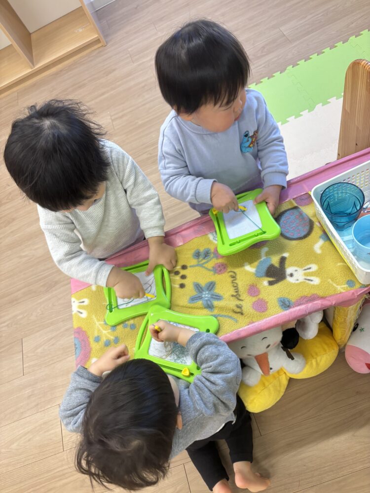 お絵描きマグネットボードは、「綺麗だねー」「グルグルー🌀」とお話をしながらたくさんお絵描きしました🎨✨
