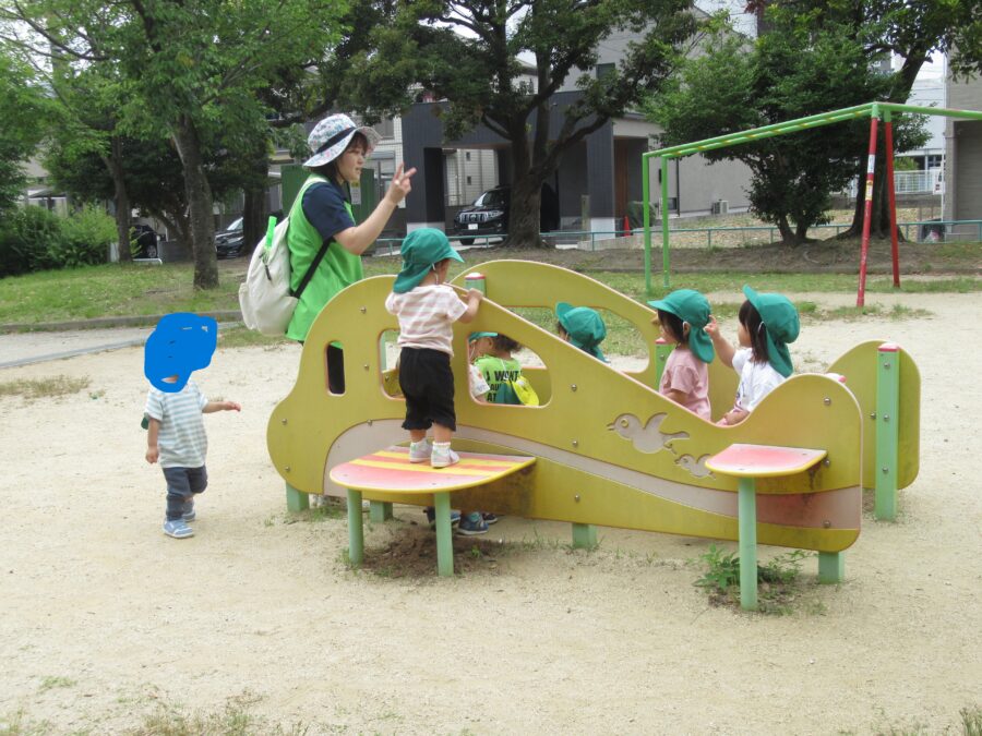公園が見えてくると、いつもとは、違う大きな木があったり、遊具が沢山みえてきて、みんなも嬉しそうです![]()