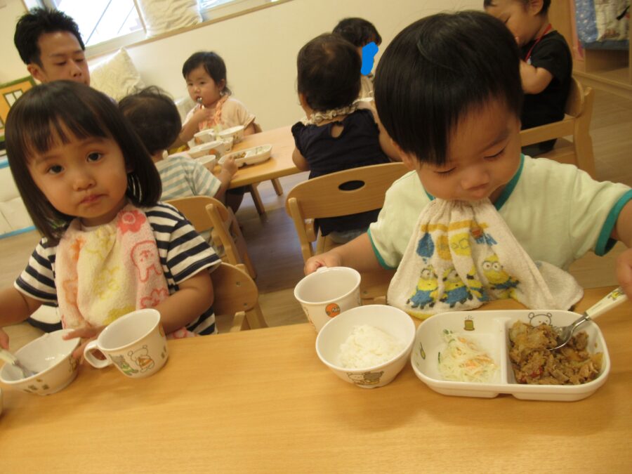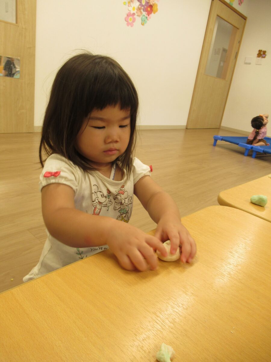 お餅みたいで気持ちいね!こっちは色を付けてみたよ! フォークも使ってグサグサ、伸び伸び楽しかったね沢山遊んだらお腹もすいたね! 給食もみんなモリモリ食べました!今日も元気な子どもたちでした!明日も沢山遊ぼうね