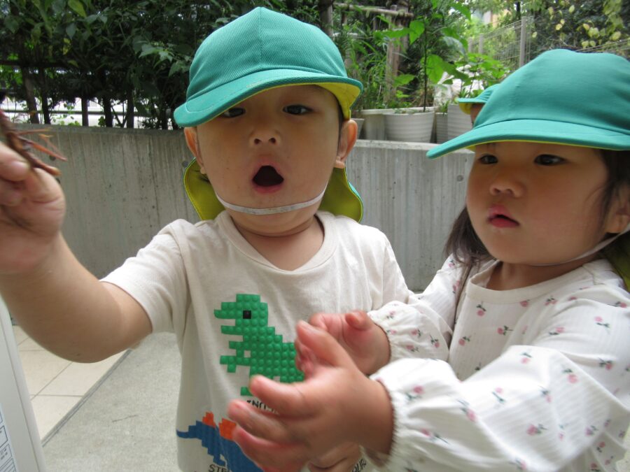 バッタを見つけたお友だち。かかんに触ろうとする子どもたち。