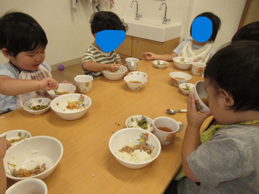園庭で遊んだらお腹が空いちゃったね!今日も給食が美味しくて沢山お代わりをしたうさぎ組さんでした!
