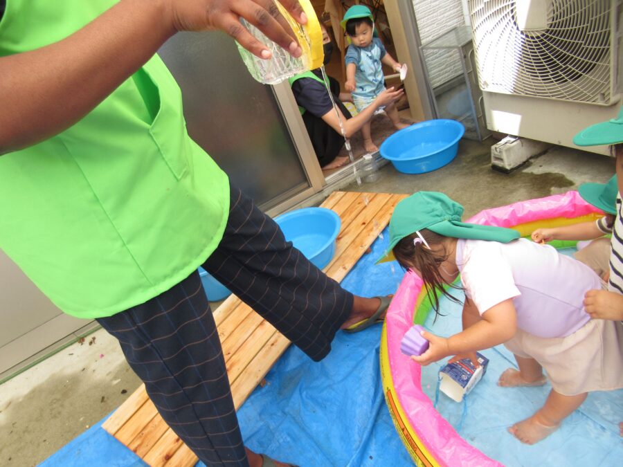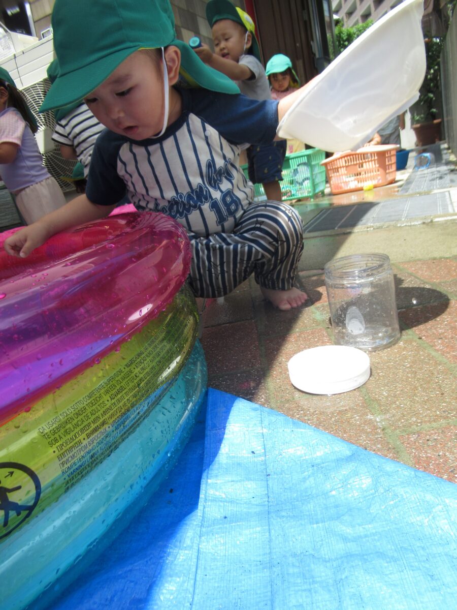 お水が冷たくて気持ちいいね!ジャー!先生がお水を雨みたいに降らせてくれたよ!こっちはお水を沢山集めて遊んだよ!今日も沢山濡れていっぱい遊んだ子ども達でした