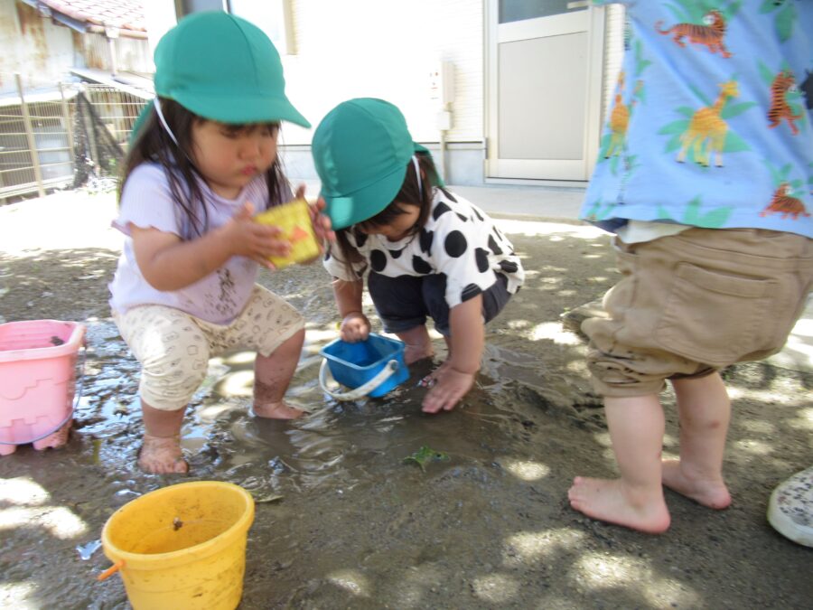 嬉しそうに水たまりに足を入れてみる子、