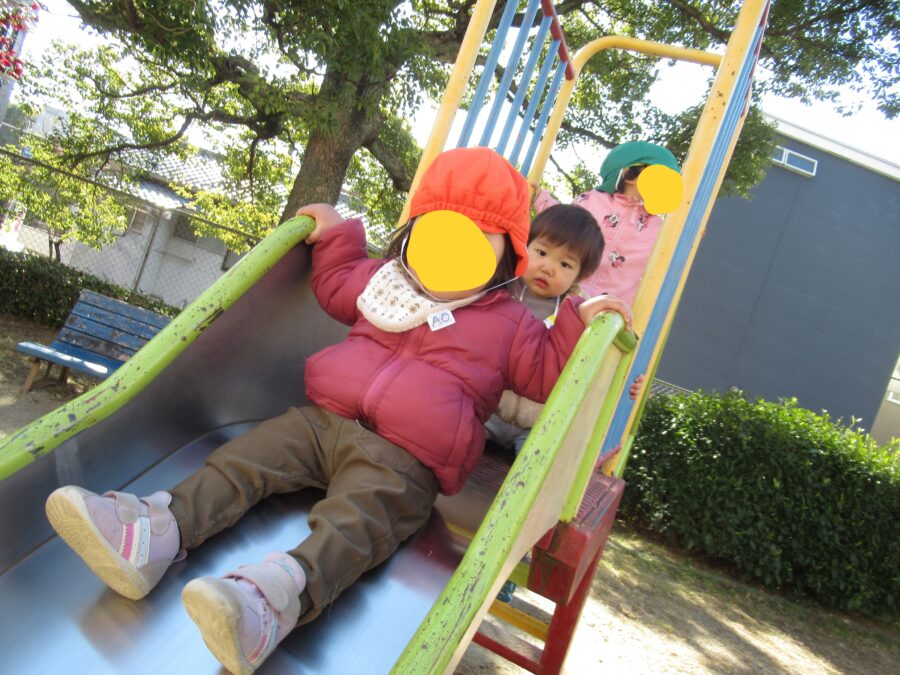 ひよこ組さんがすべり台の階段を登るときは