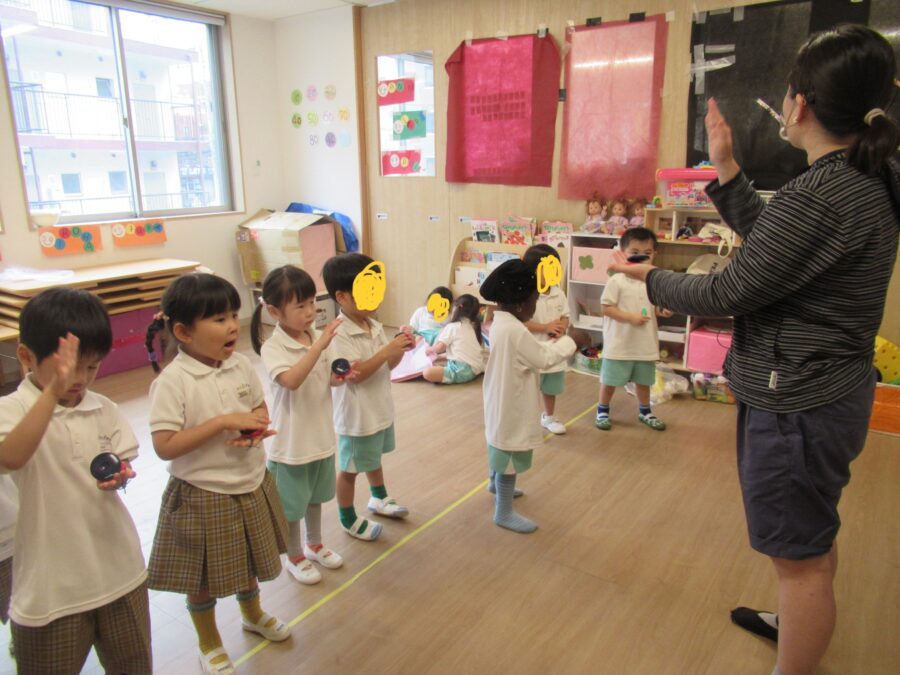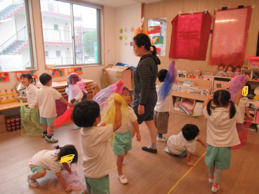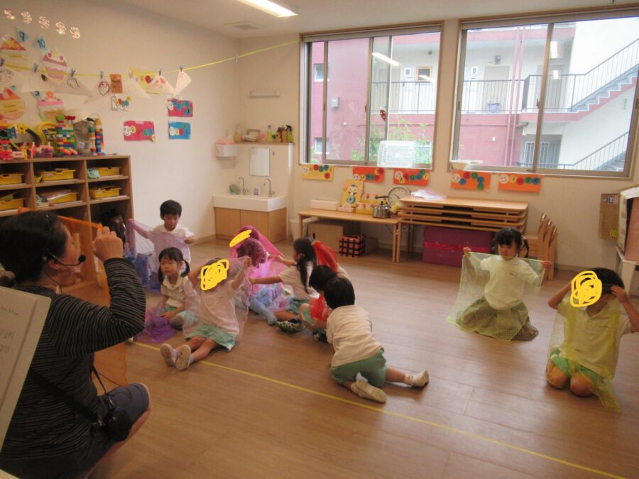 🐼ぱんだ🐼 リトミック🎵 今日はリトミックの日🎵 ふわふわのカラーシフォンでスタートです⭐︎ その後はカスタネットもしました🎶 「おばけなんてないさ🎶」 歌も歌いながら上手に叩いていましたよ☺️ カテゴリ: 塩釜口(0~1歳) タグ: