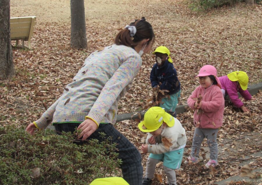 岩山の下では落ち葉のかけあっこ!