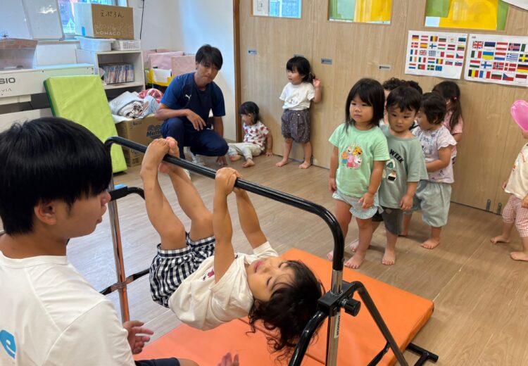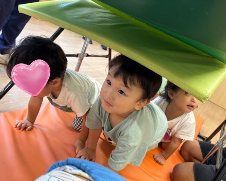 今日の体操の時間は、鉄棒をしました。上手にぶら下がって楽しそうだったね🎵 鉄棒の上にマットをかけて、「よいしょ…」と乗っかったりもしました😆