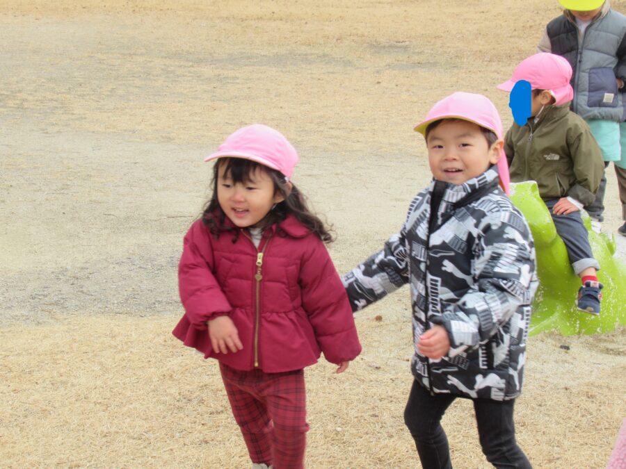 雪が降っているのをみて「ゆきだ!!」と大興奮のみんな。