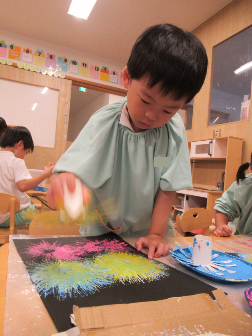「大きい花火見たことあるよー!」「この前おばあちゃんと見たよ💓」と夏の思い出も話しながら製作していました🎆