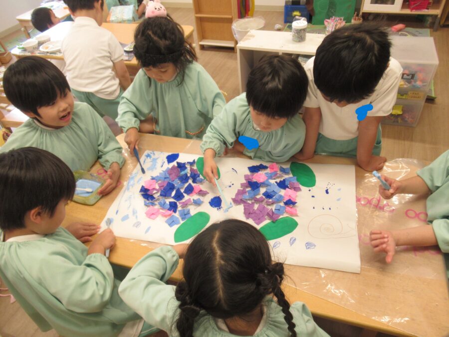 出来あがったアジサイの花を、紙に貼りましたよ💓