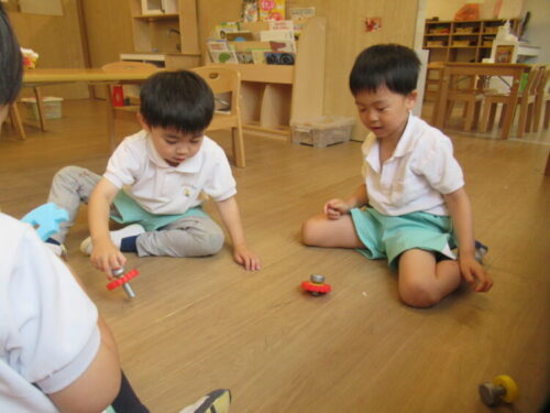 こちらでは、ブロックで作った独楽をまわして遊んでいました♬