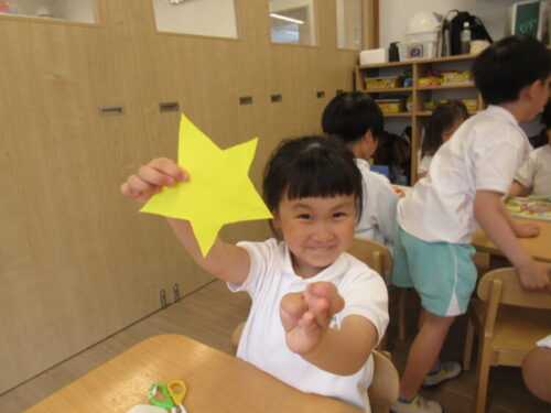星やハート、ちょうちょの形に切れた折り紙を画用紙に貼り、絵の具でペイント🖌