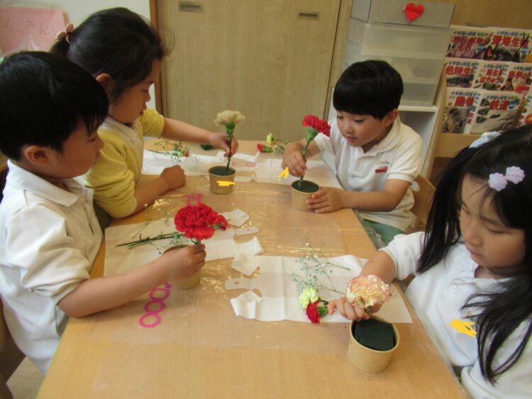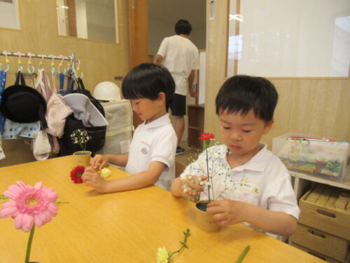 フラワーアートでは、お花の名前や匂いに興味を持ってお花に触れていました🌼