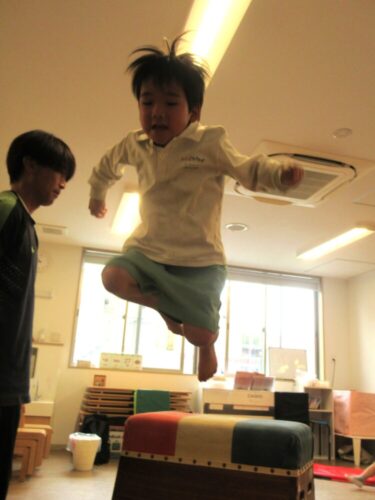 カエル🐸の姿勢で跳び箱の上に乗って、