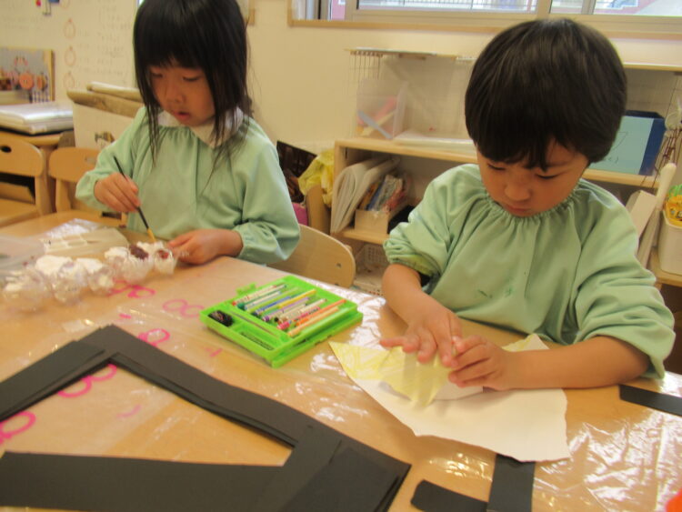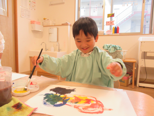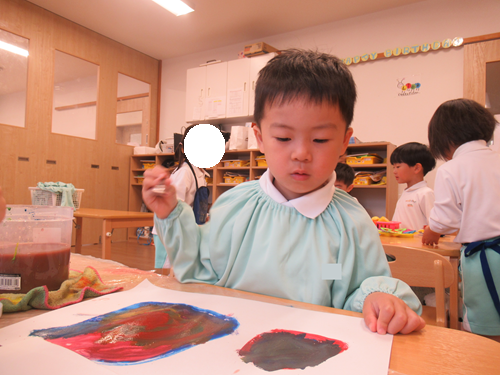 赤、黄、青色の絵の具を用意すると「青と黄色でみどりになった!!😀」と色の変化を楽しんでいました♬