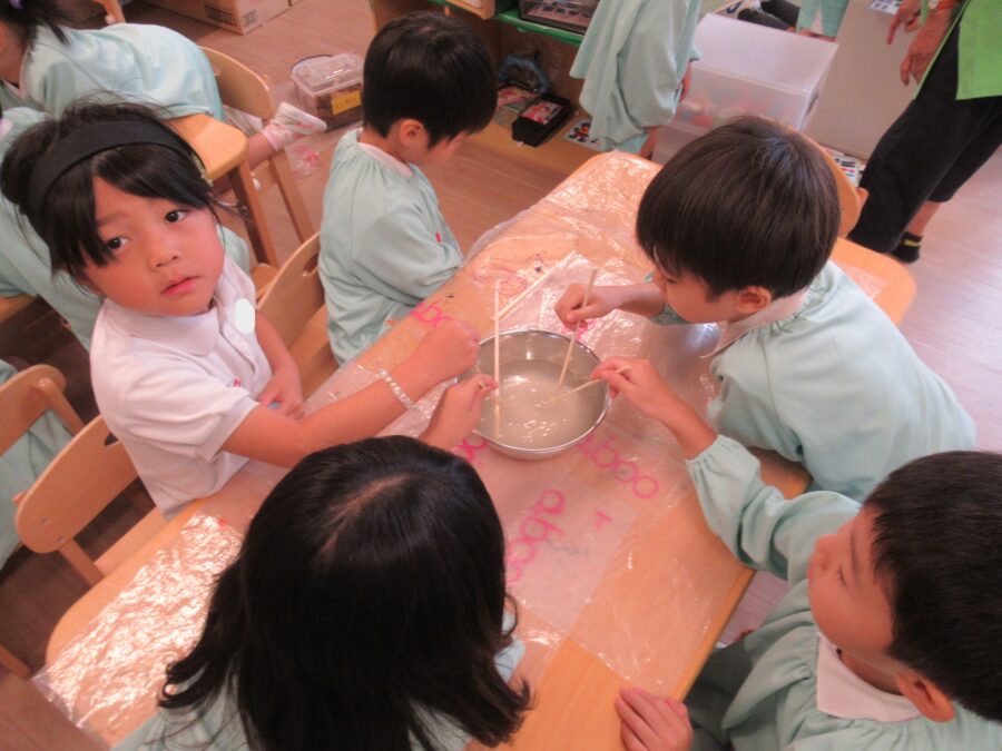 ぞう組では寒天作り、ぱんだ組ではお魚釣りをしました