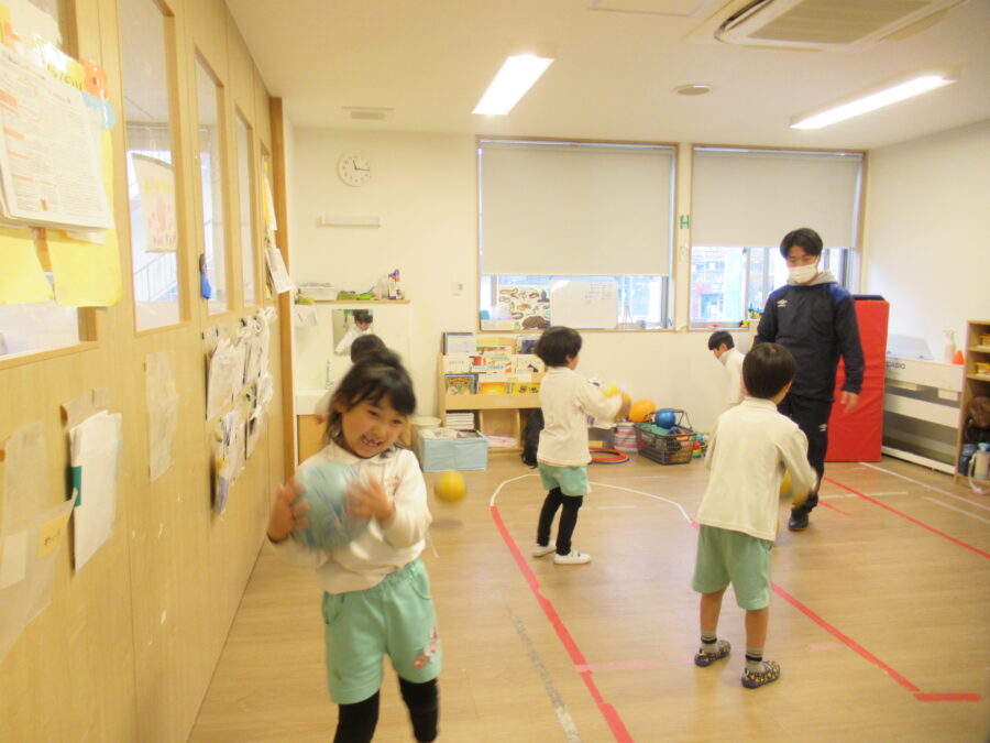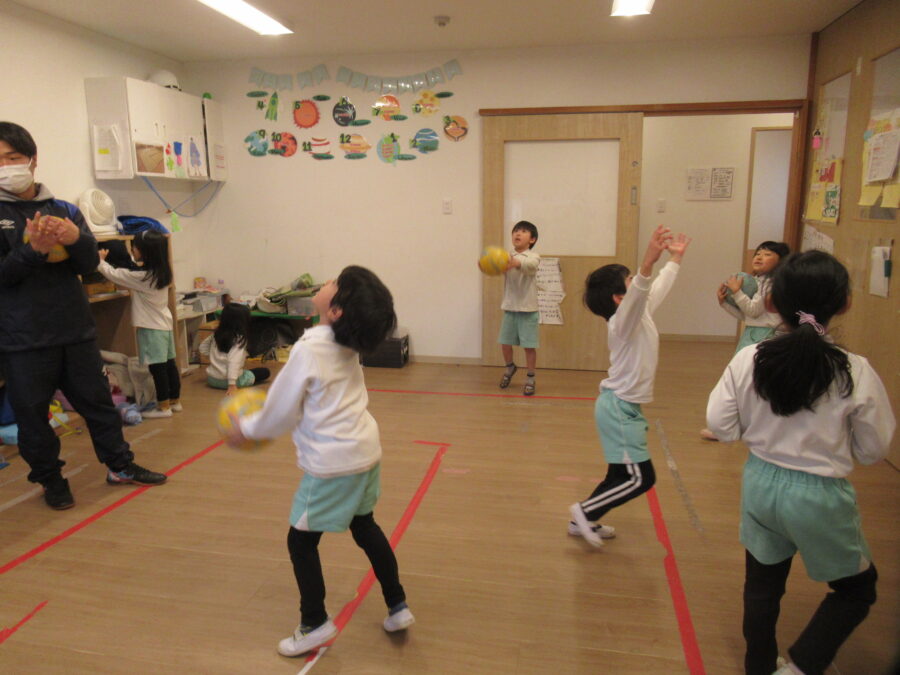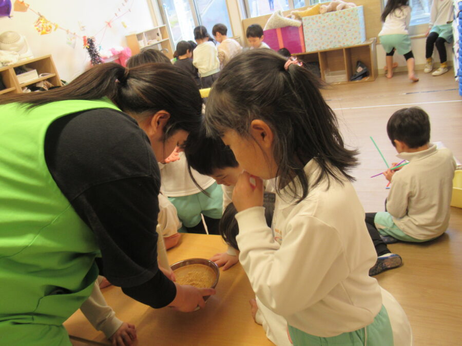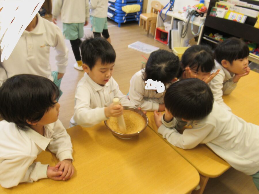 昨日の豆まきの豆を、りすさんのお部屋で、すり鉢でゴリゴリ‥すると、きなこに変身✨美味しそうな匂いがしました。   体操は、みんなでボールを使って楽しく参加しました(*^-^*)