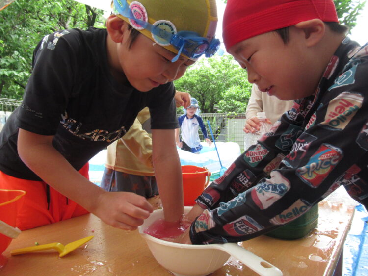 色水遊びでは、混ぜ合わせる量を調節しながらさまざまな色を作って遊んでいました😆
