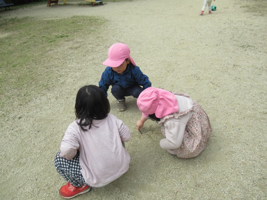 お気に入りの木の枝でみんなで地面に描いてみたり