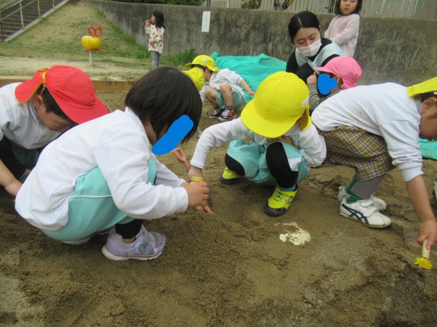 砂場ではりす組、ぱんだ組、らいおん組そろって砂遊び
