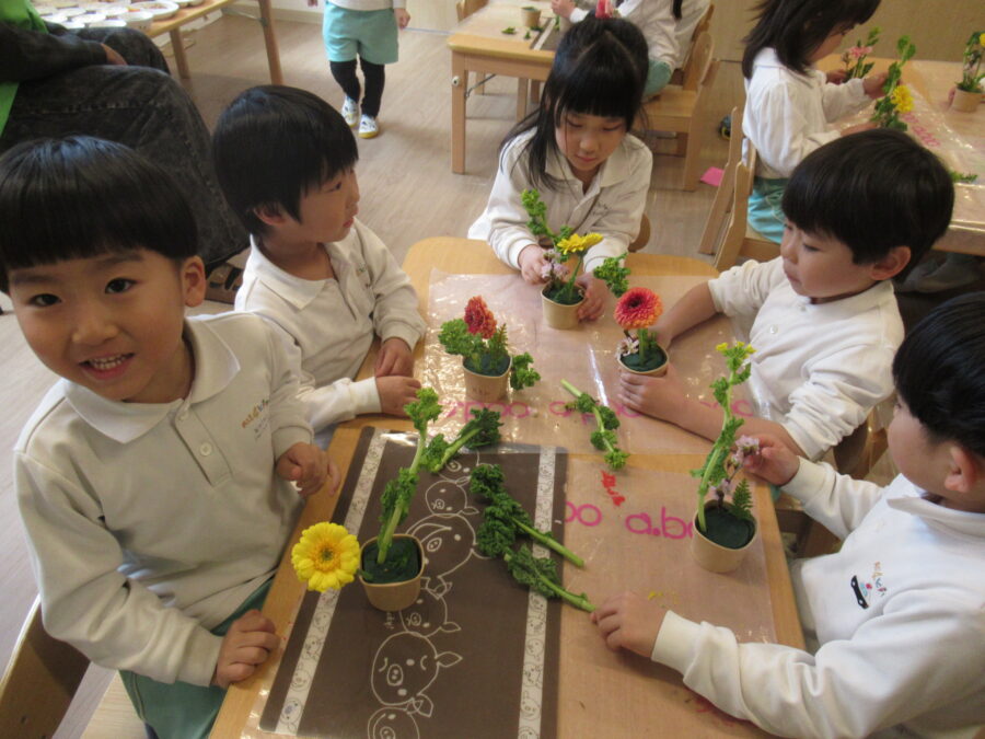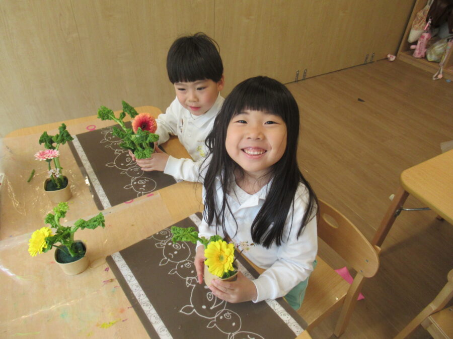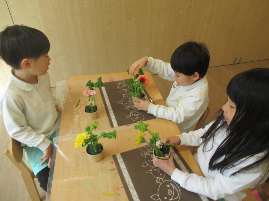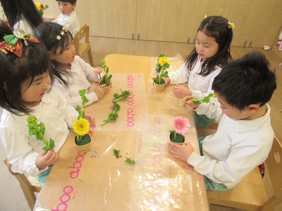 今日は、給食を食べる前にフラワーアートをしました。同じお花はないので、みんなで相談しながらお花を生けることができました😊