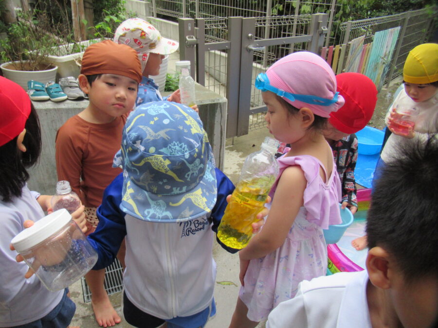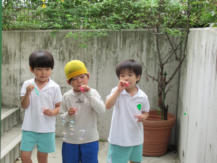 今日は、色水を使って混ぜて遊びました。大好きなシャボン玉もみんなで一緒にやったり…