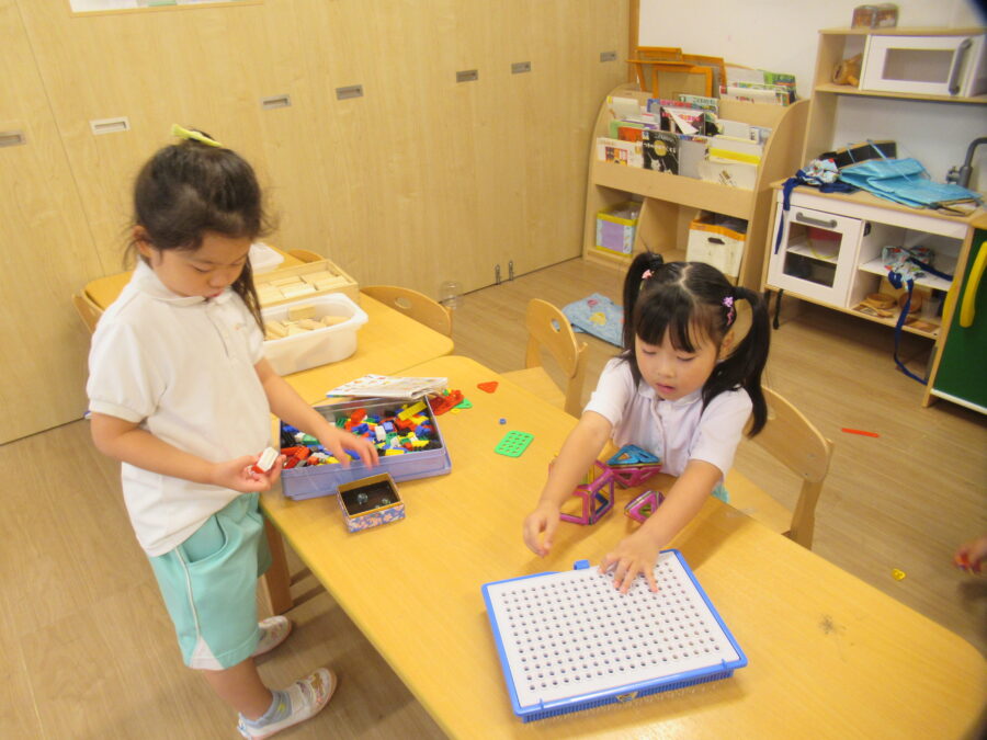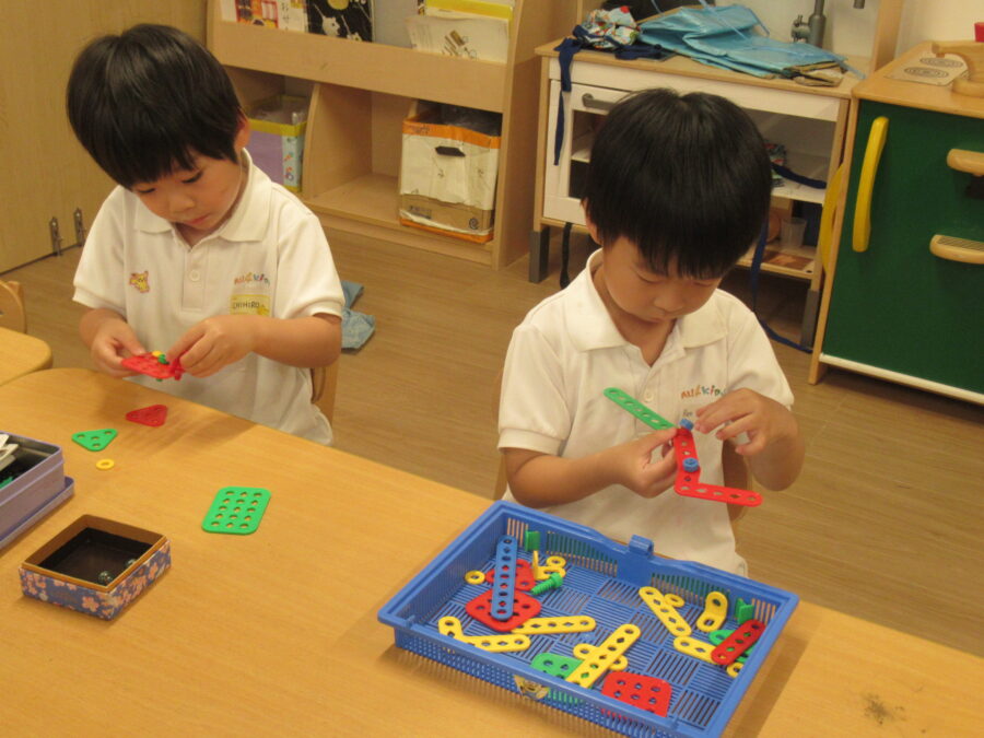 🦁さんに新しい玩具が来ました。どうやってやるのかなあ? 木の玩具の周りに丸い箱を並べて「お料理できるよ~。」と、小さなキッチンが出来上がりました☺ 何やら真剣な表情で、作っていました(^^♪
