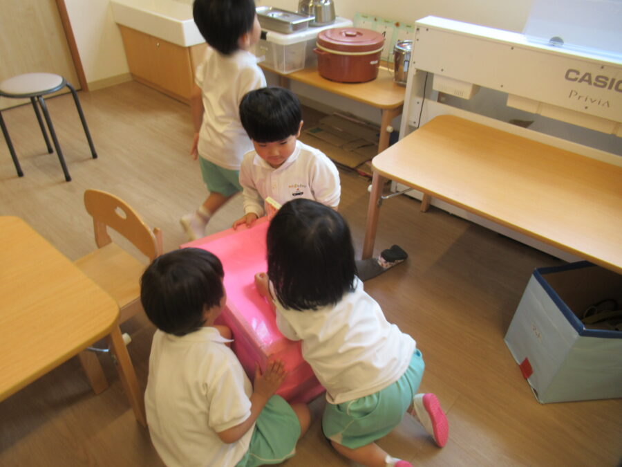 ピンクの箱で何しよう?なんて考えていました。今日も沢山遊んだね(^^♪