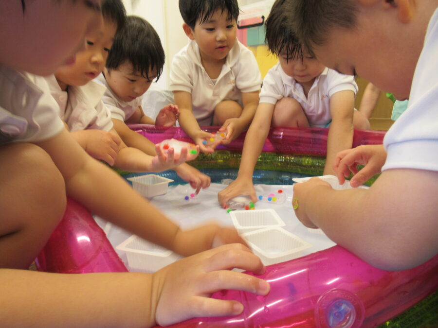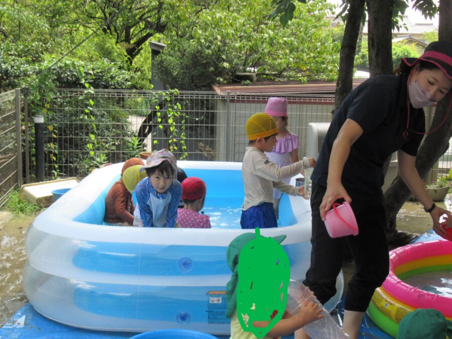 今日も暑かったので、プールに入っていい気持ち(^^♪ 入らない子も、ランチルームで🐼さんが作った氷を触ってあそびました。「ひゃあ、冷たいΣ(・ω・ノ)ノ!」と氷を触って楽しんだりしました。