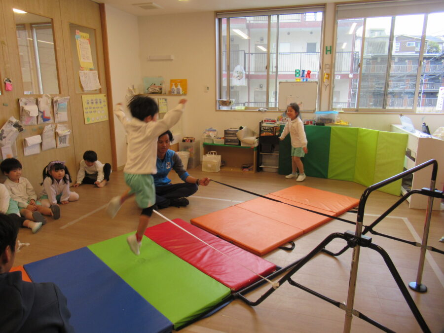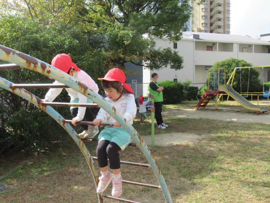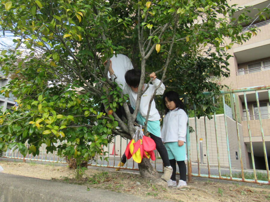 体操の時間、皆でマットを使い順番に頑張っていました😊  頑張ってジャンプ!公園では、遊具で遊んだり… 木の実をとったりしました😊